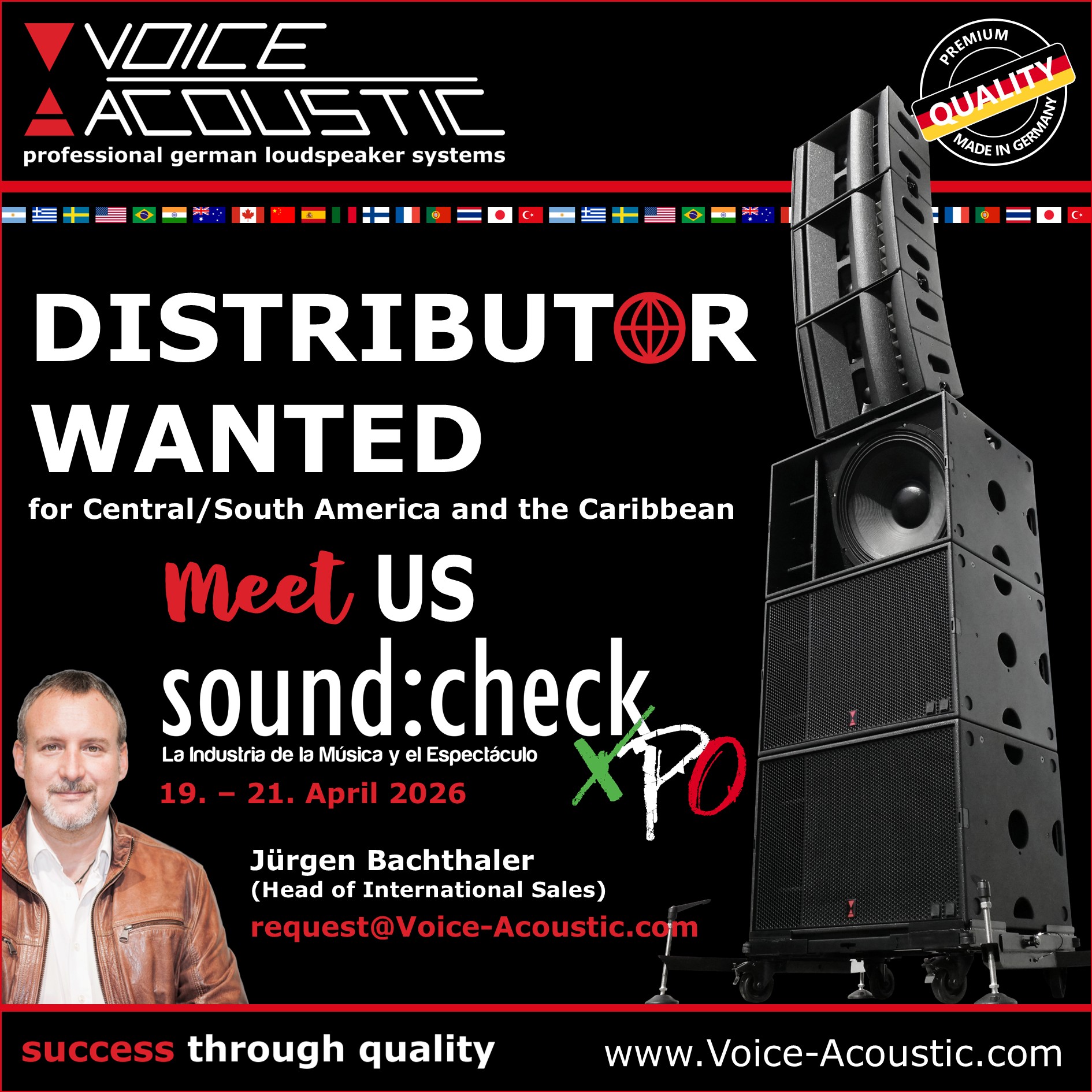 Meet our Voice-Acoustic International Sales Manager Jürgen Bachthaler at the SoundcheckXpo in Mexico at the stand from our distributor Hi Tech Audio México. The fair starts next Sunday 30 March. You are welcome to visit us and discover our innovative pro audio solutions made in Germany.