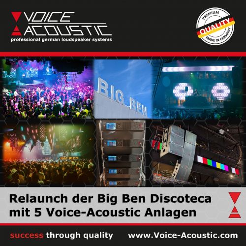 Vtècnics en Ruta S.L., ein führendes Unternehmen für professionelle Beschallungssysteme und exklusiver Vertriebspartner von Voice-Acoustic in Spanien, war für die Installation des neuen Beschallungssystems in der Haupthalle der Big Ben Discoteca verantwortlich. Der Veranstaltungsort ist nun mit insgesamt 58 hochmodernen Pro-Audio-Lautsprechern des renommierten deutschen Herstellers Voice-Acoustic ausgestattet, die ein beeindruckendes und hochwertiges Klangerlebnis für alle Besucher gewährleisten.