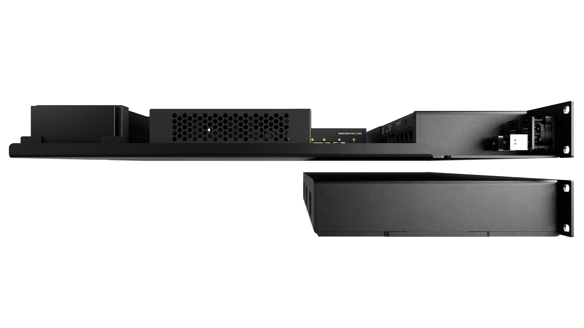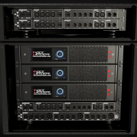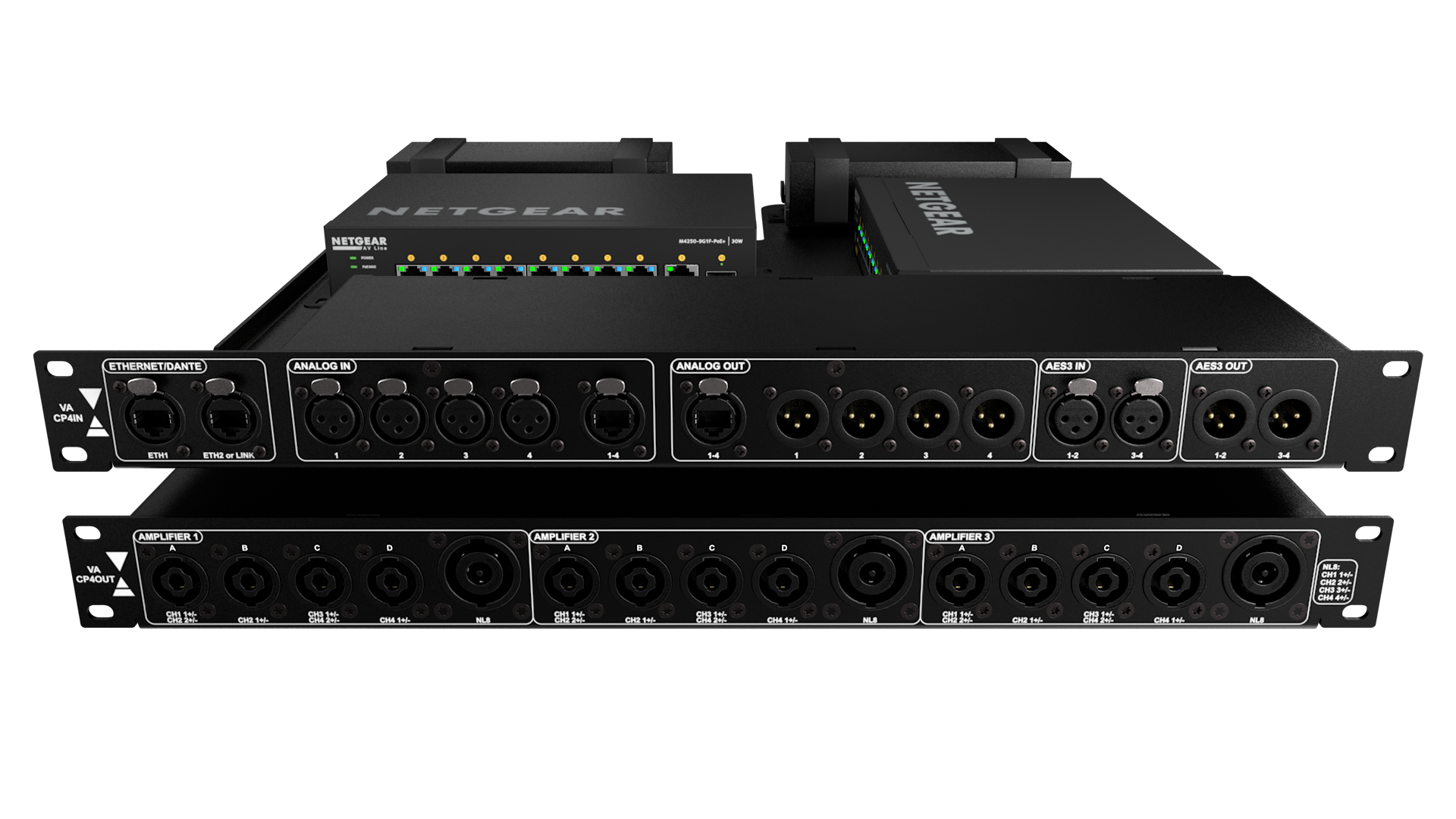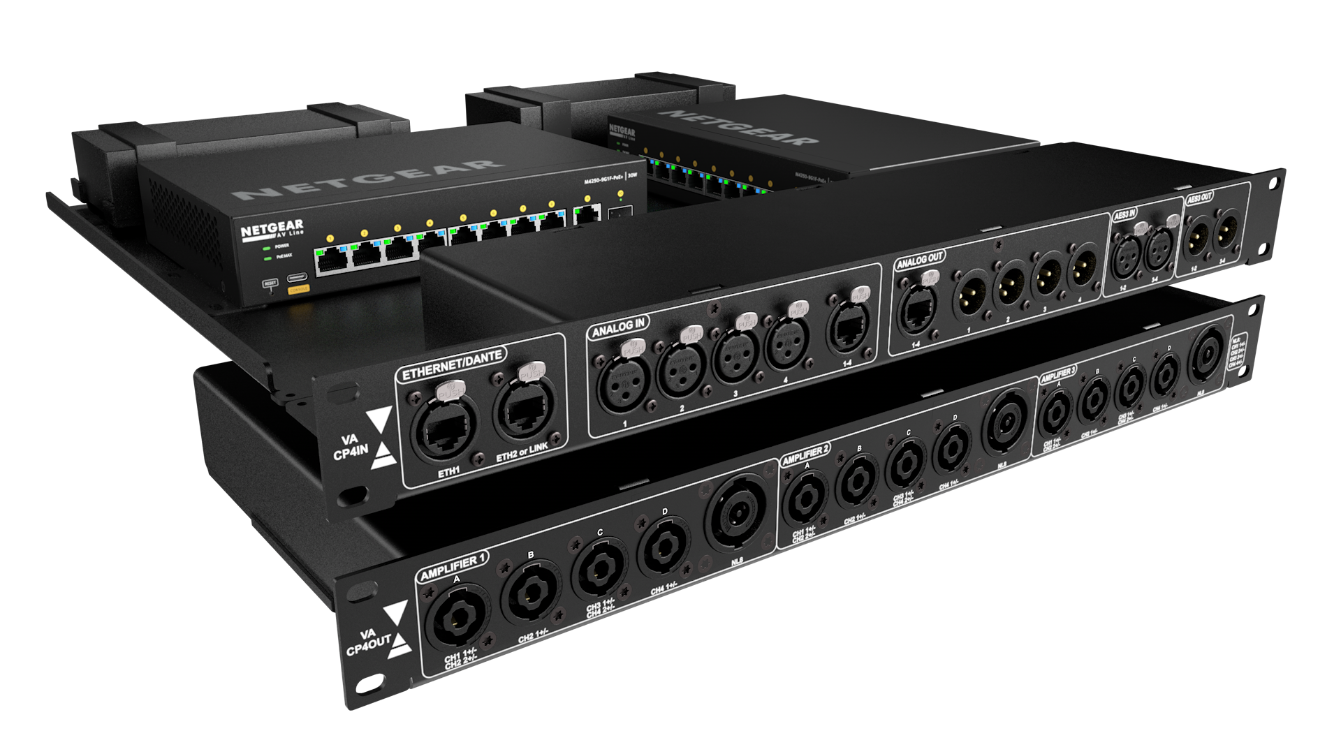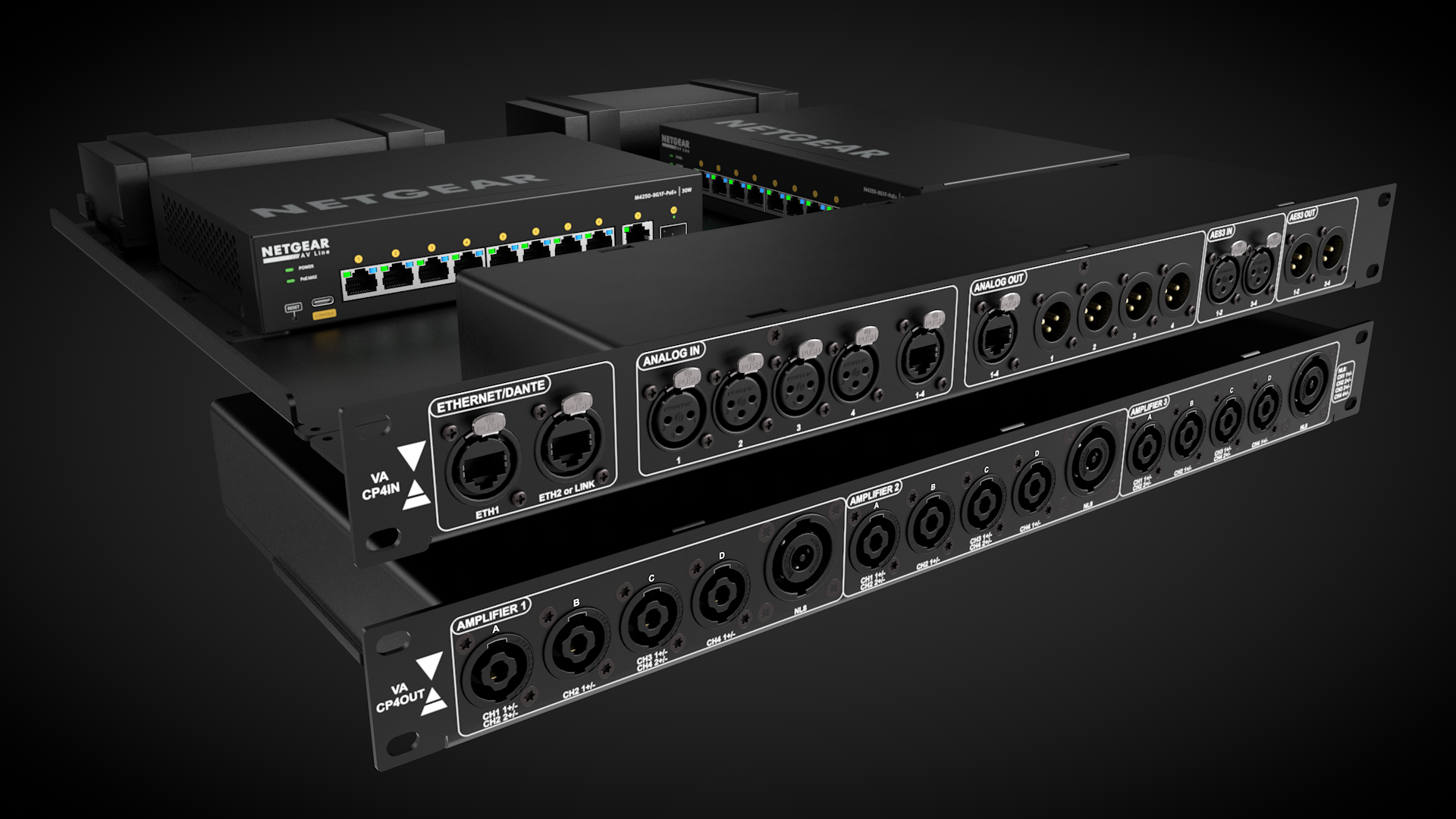 Das leichtgewichtige Aluminiumgehäuse hat eine sehr geringe Bautiefe und ermöglicht dadurch das rückseitige Anschrauben der optionalen VA CP-4-Rackshelf. Diese Rackablage hat Montagelöcher für die Befestigung von einem oder zwei Netgear AV Line M4250 10-Port-Switchen mit zugehörigen Netzteilen. Dadurch können die Verstärker im Rack platzsparend für Remote- oder DANTE-Netzwerke (auch redundant für ein primäres und sekundäres Netzwerk) verkabelt werden, ohne dass für die Netzwerktechnik eine zusätzliche Höheneinheit im Rack notwendig wird.