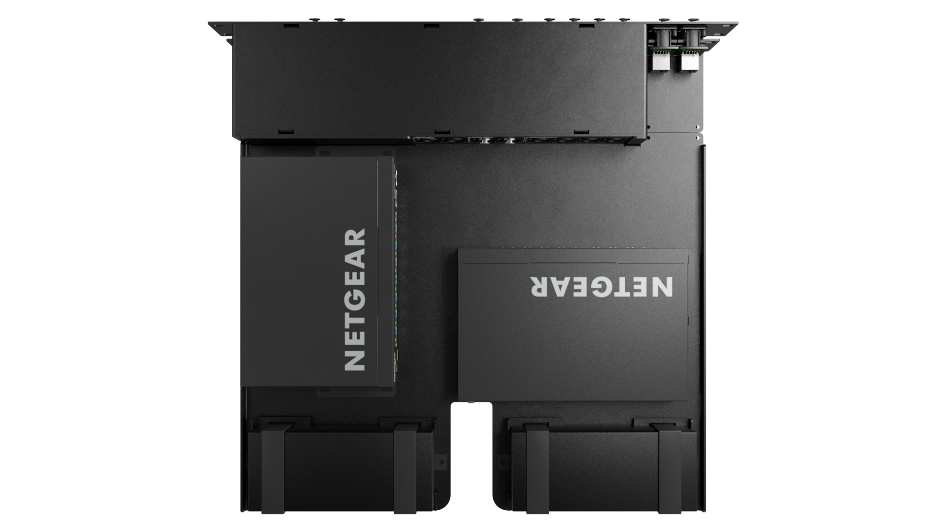Hohe Stabilität durch gekantete Seitenwangen. Montagelöcher zur Befestigung von einem oder zwei Netgear AV Line M4250 10-Port-Switchen mit zugehörigen Netzteilen